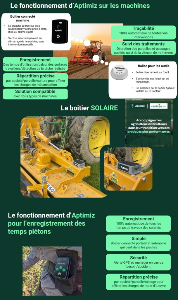 Vantage AM propose la gamme Aptimiz (boitier piéton, tracteur et outils) en précision RTK avec plateforme de gestion web.